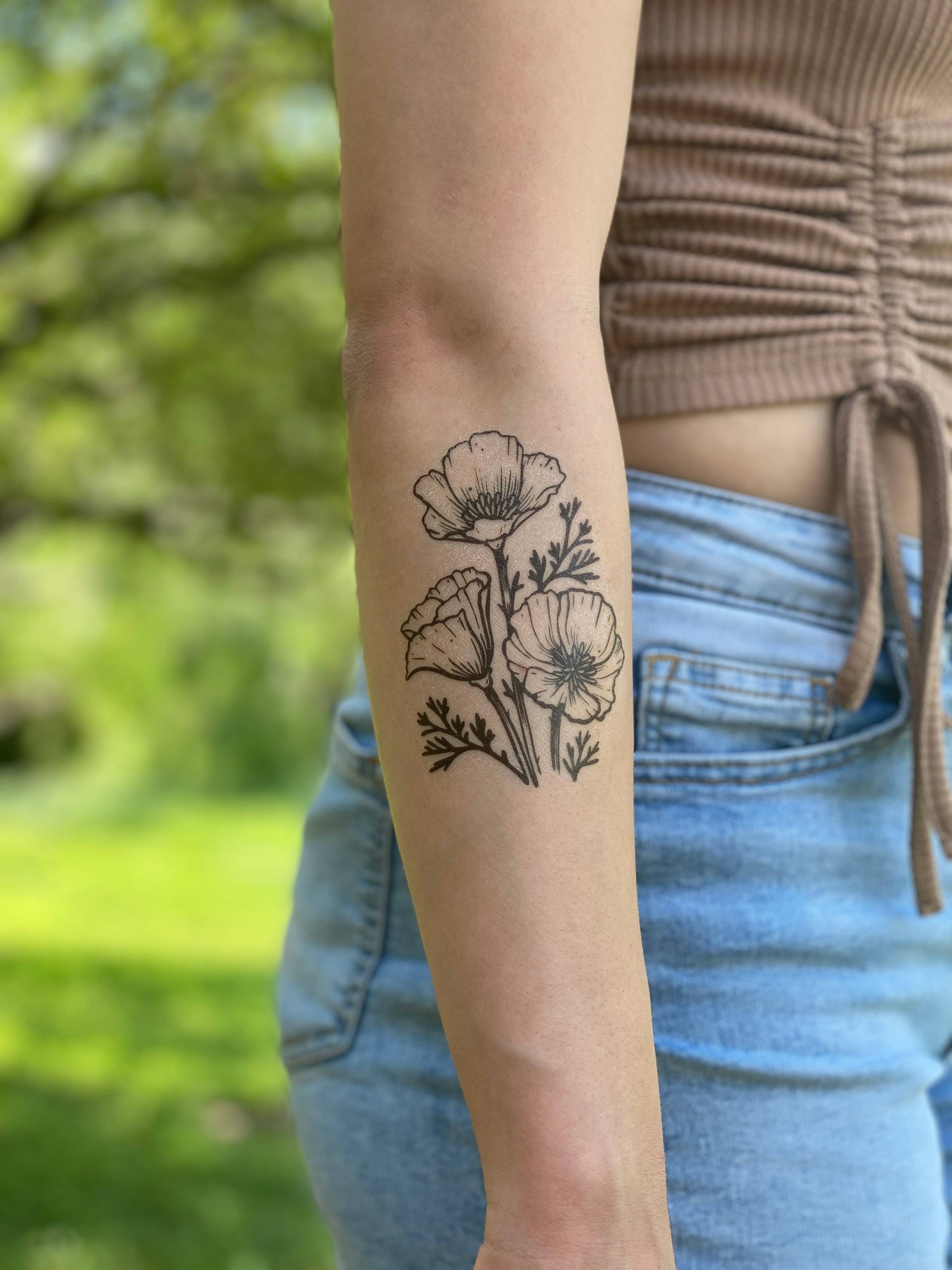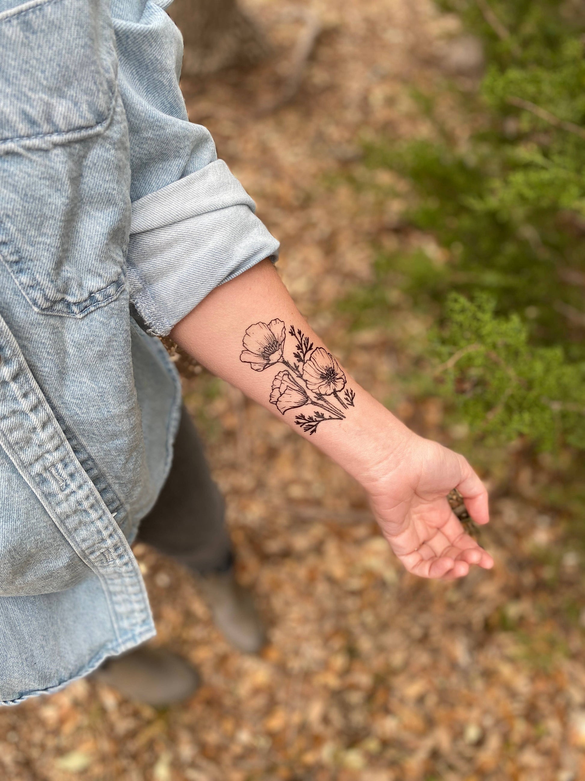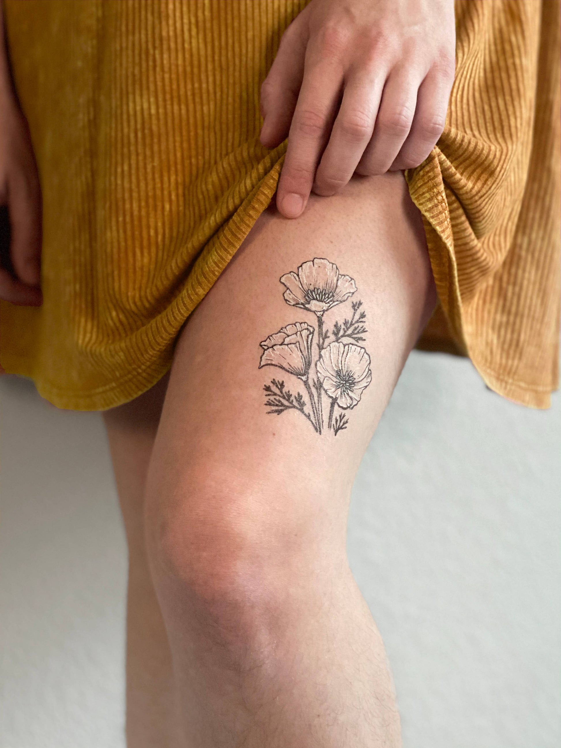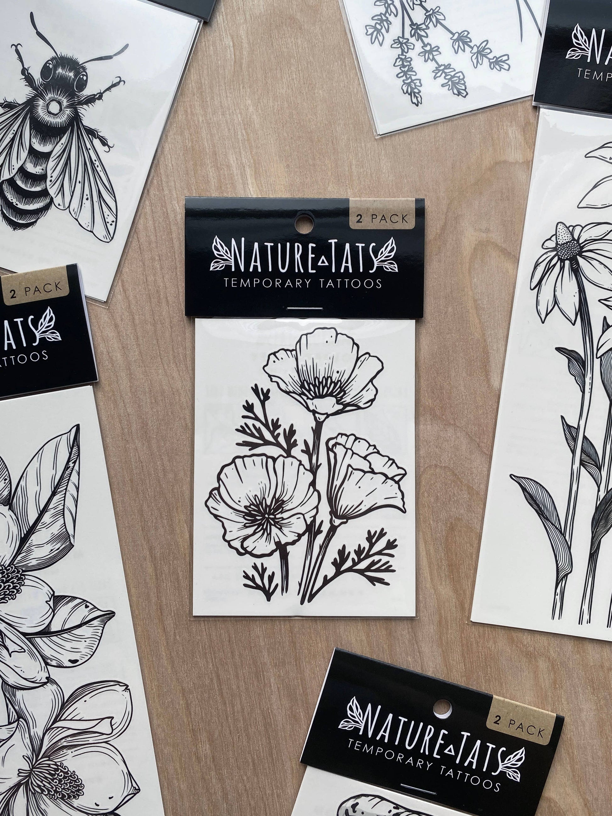 Golden poppy flower temporary tattoo. This lovely flower is neon orange in real life, the state wildflower flower of California but it can be found growing in many other areas of the US. Lasts 2-5 days • Water-resistant • Comfortable • Skin Safe All original designs by Allison Wilcoxen in Austin, Texas.