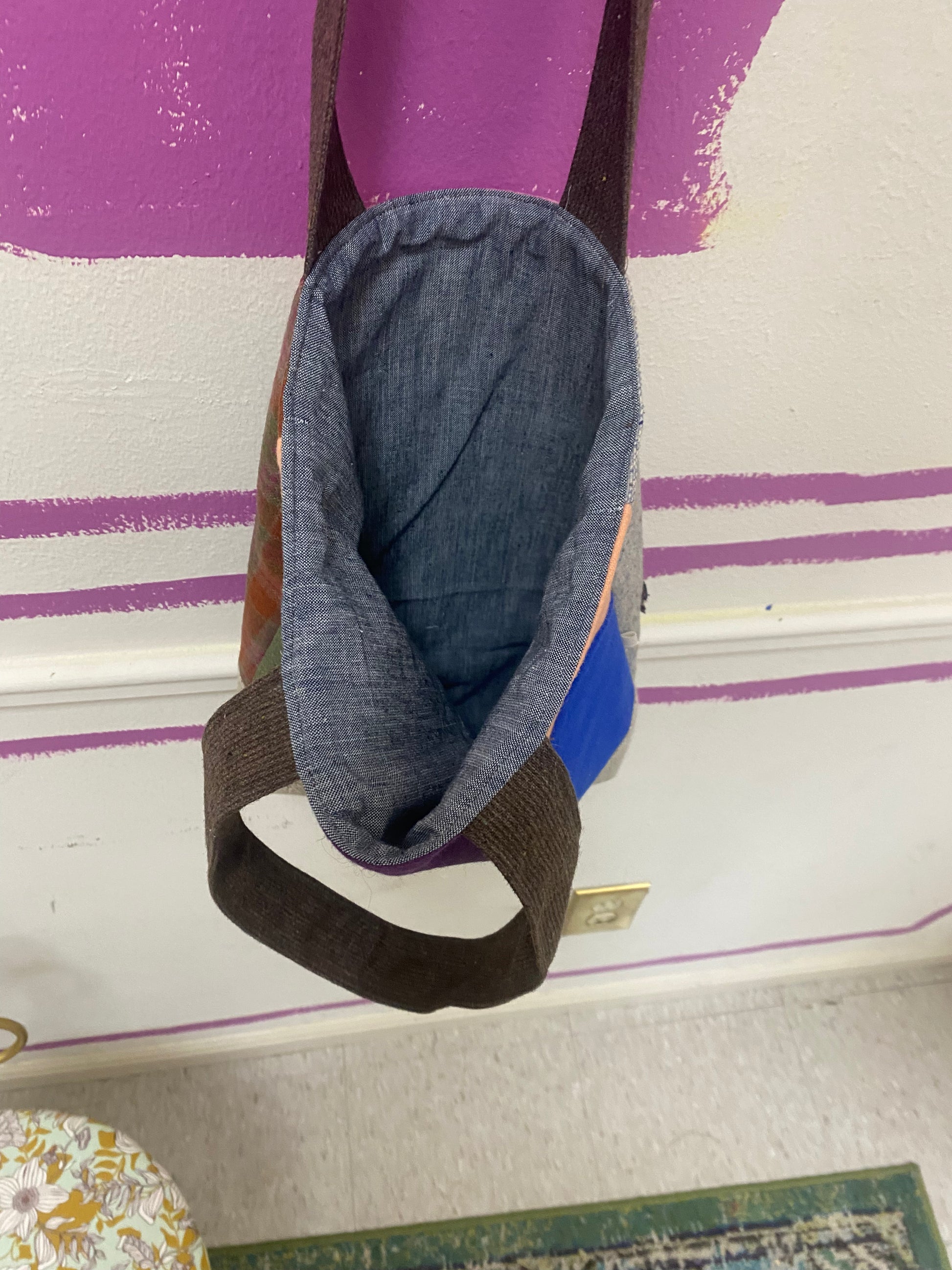 A tote bag made from an unfinished tattered quilt top made of wool scraps and adorned with a little bird cut from a pair of pants.