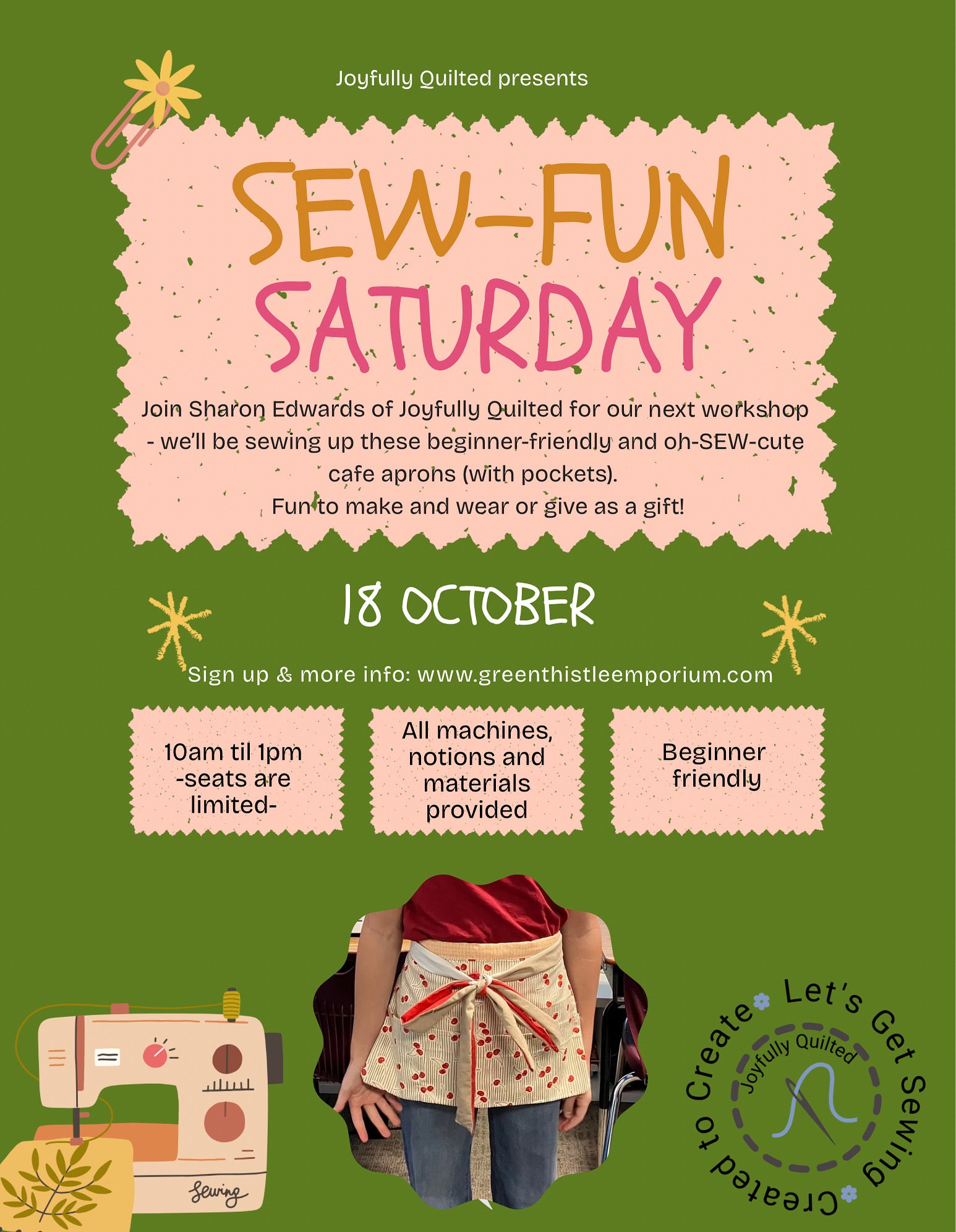 Sew Fun Saturday! Join Sharon Edwards of Joyfully Quilted for our next workshop. We'll be sewing up these beginner friendly and oh-SEW-cute cafe aprons (with pockets).